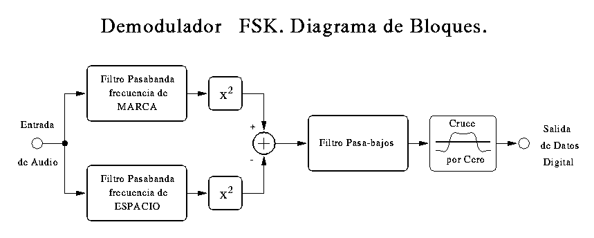 Cómo funciona: En el fichero doc.txt se describe el funcionamiento del programa. En la siguiente figura se muestra el diagrama de bloques del demodulador FSK: